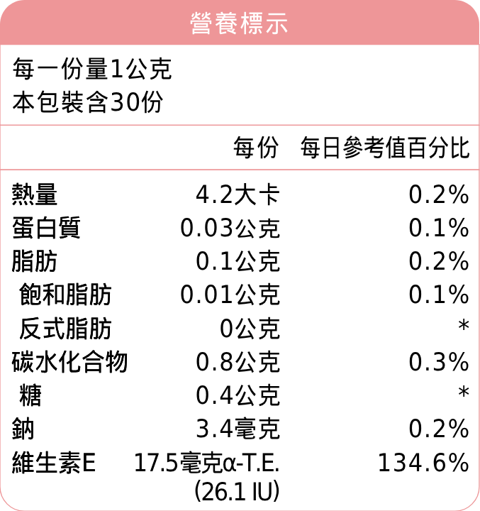 參考值未訂定。每日參考值:熱量2000大卡、蛋白質60公克、脂肪60公克、飽和脂肪18公克、碳水化合物300公克、鈉2000毫克、維生素E 13毫克 α-TE。